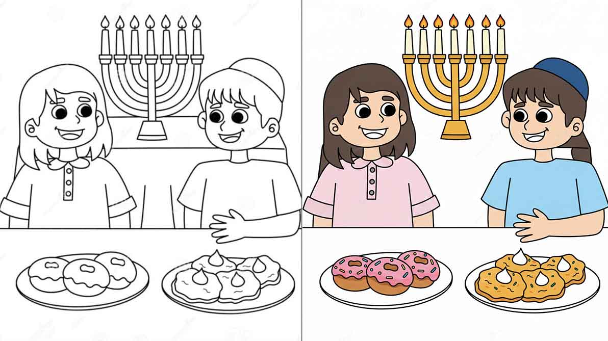 Many Hanukkah coloring pages include sufganiyots, the sweet fried donuts traditionally eaten during Hanukkah. Explain their historical and cultural significance while allowing children to experiment with coloring the donuts in fun and vibrant ways. Kids will love learning about Israeli folklore and traditions through this tasty and artistic activity.